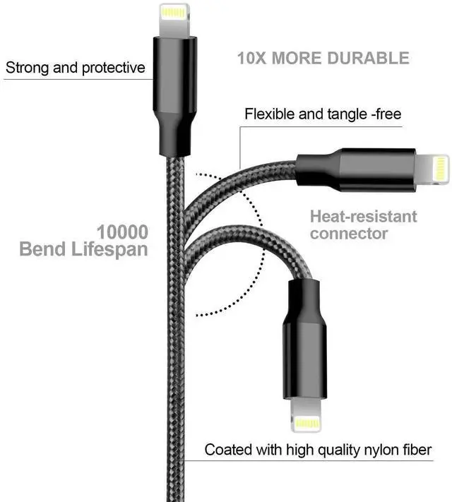 ? DURABLE & STRONG -- Tangle-free nylon braided fiber material strong and wear-resistant make CUGUNU iPhone charger cable more durable more flexible than standard iPhone cable. Reinforced stress points designed to withstand 10000+ cycles of flex test without inner failure.? FAST CHARGING -- certified built-in terminal and smart chip ensure your devices are charged safely at their fastest possible speed. High-quality four-core copper wires support a maximum charging speed up to 2.1A and data transmission at speeds of up to 480Mbps.? STRICT QUALITY CONTROL -- Unique design prevents the aluminum case at both ends of iPhone Charger cord from coming unglued.