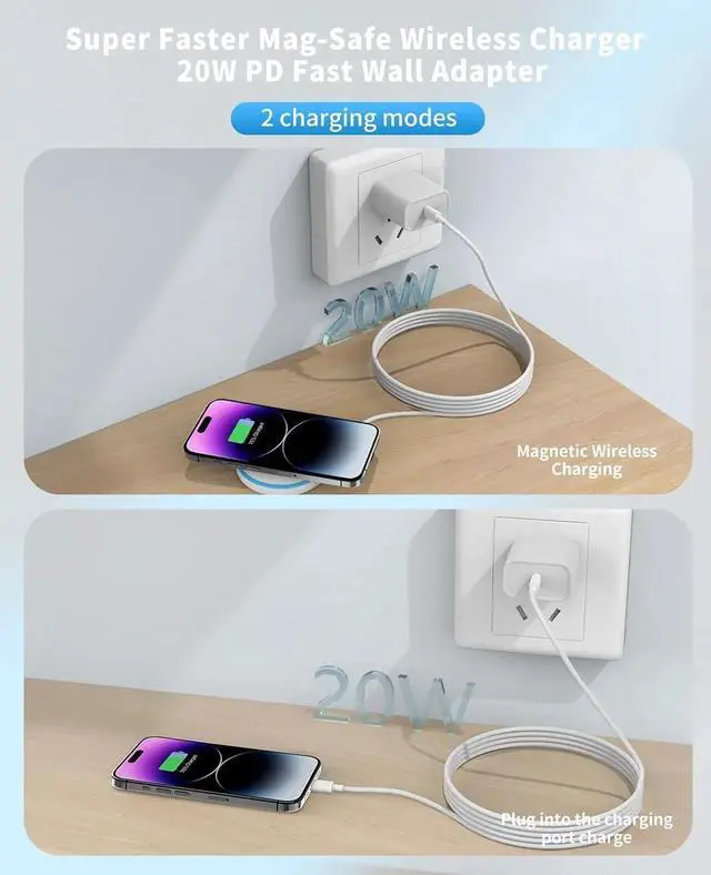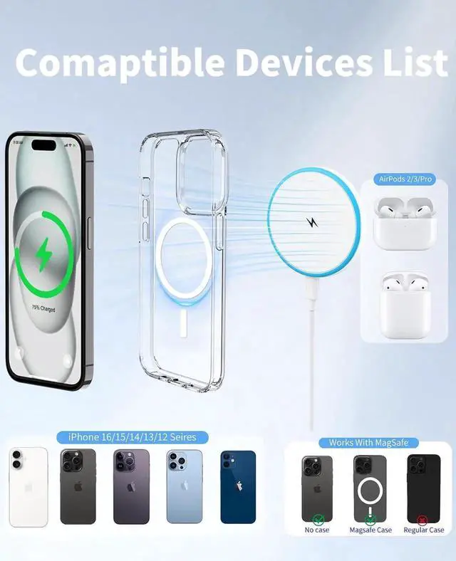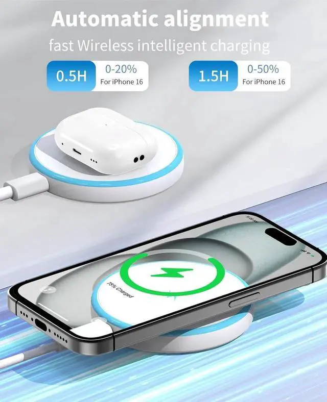 Wireless Charging Compatibility: This magnetic charger is designed for seamless wireless charging of iPhone 16 15 14 13 and 12 series AirPods 3/2/Pro 2/Pro and other Qi-enabled devices.