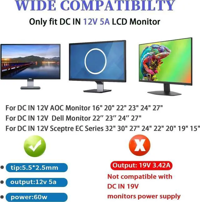 Monitor Power Supply Cord: This 12V monitor dc power cord compatible for dc in 12V AOC Monitor 16 20 22 23 24 27; for 12V 21.5 22 23 24 27 Screen IPS LED LCD Monitor; for 12V Sceptre EC Series 32 30 27 24 22 20 19 15 E248W E225W E205W E275W Screen LED Monitor Supersonic LCD Widescreen HDTV; Please Note??? NOT FIT FOR DC IN 19V 19.5V monitor.??? High Efficiency and Reliability; Automatic Overload cut-off; FCC CE RoHS Safety Certificates Approved Short Circuit & Over Voltage & Current Protection / Low Fever / No Noise.