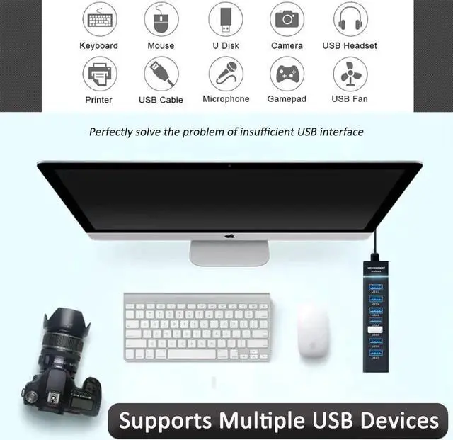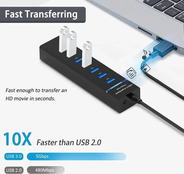 7-Port USB 3.0 Splitter USB hub turns one USB port into Seven support 7 ports to work at the same time without any pressure and keep the temperature in the middle range. Plug and play no need driver easy to use. And it's backward compatible with your older USB 2.0 / 1.0 devices. (NOT support charging) Wide AppliactionVIENON 7-port USB Extender applies to various devices: laptop pc tower XBOX PS4 flash drive keyboard mouse card reader HDD cellphone OTG adapter printer camera USB fan or any other USB Peripherals. 5Gbps Data Transfer SpeedThis USB hub 3.0 syncs data at blazing speeds up to 5Gbps which is more than 10 times faster than USB 2.0 fast enough to transfer an HD movie in seconds.