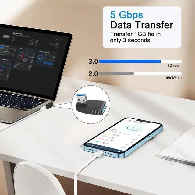 & TRANSMIT: The USB 90 Degree Adapter utilises SuperSpeed USB 3.0 to provide your device with ultra-high speed data transfer rates of up to 5Gbps/S and charging speeds of up to 5V/2A.