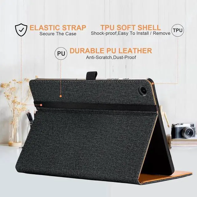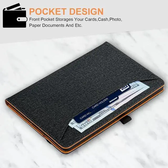 Multifunctional Portable: 1. External Elastic Fixing Band Keep The Case Closed Without Fear Of Accidental Opening. 2. Elastic Hand Straps Help You Hold The Tablet Comfortably and Tightly Improve Safety When Using The Device. 3. Front Pocket Design Storages Your Cards Cash Photo Paper Documents And Etc.