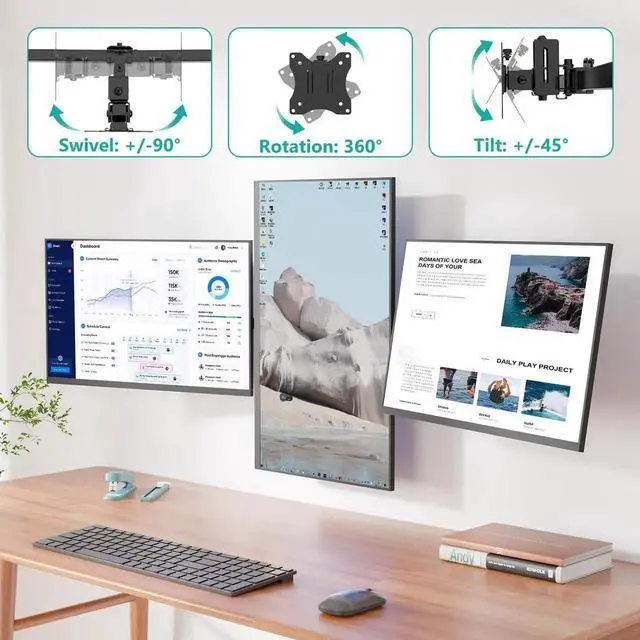 Fully AdjustableThis triple monitor wall mount offers ±45° tilt for optimal vertical viewing angles, ±90° swivel for side-to-side flexibility, and 360° rotation to effortlessly switch between landscape and portrait modesensuring ergonomic comfort and versatile screen positioning for any workspace.