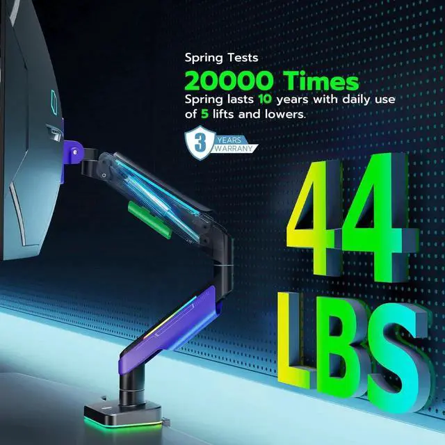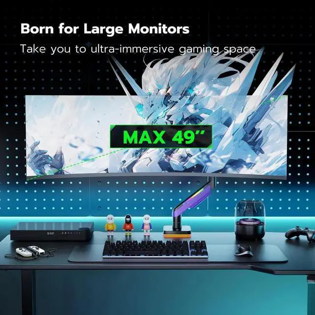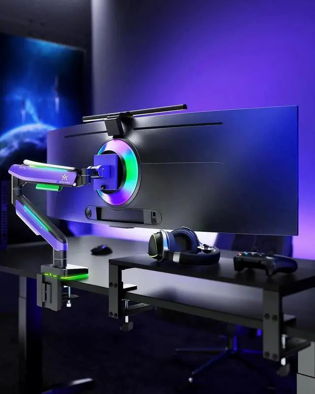 Mech-inspired Design with Lighting EffectThe ARES WING curved monitor mount features a special RGB lighting design. Dive into a world of visual delight with 20 customizable lighting modes, setting the stage for an electrifying gaming atmosphere. The neutral mech-inspired design and unique color schemes embody the essence of esports, empowering you to dominate every gaming session.