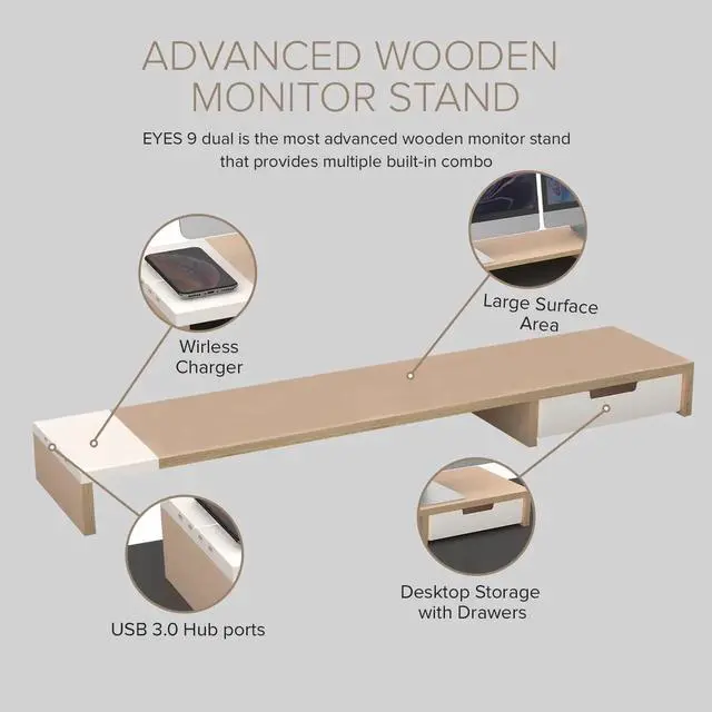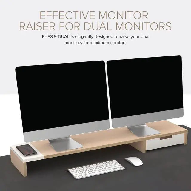 EFFECTIVE MONITOR RAISER FOR DUAL MONITORS EYES 9 DUAL is elegantly designed to raise your dual monitors for maximum comfort. It helps reduce neck and eye strain by raising two monitors higher for more comfortable viewing. This desk organizer is perfect for anyone that wants efficiency and simplicity from their workspace.