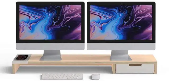 POUT E9 Dual Monitor Stand with Drawer - Wireless Charger and USB Hub (Maple White)