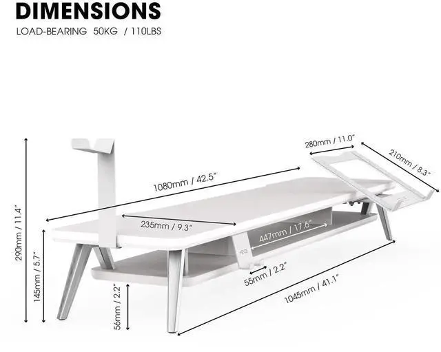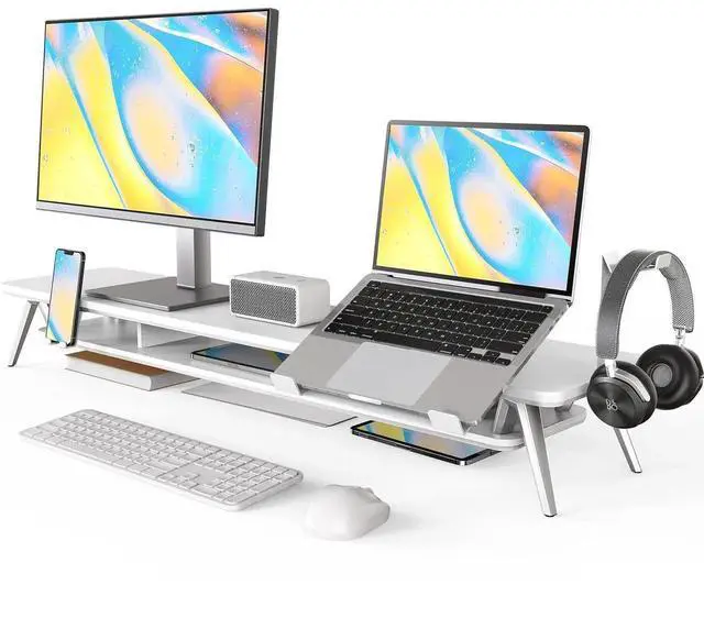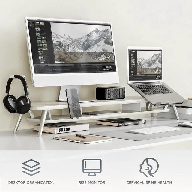 2 Tier Desktop OrganizerAt longest 42.5inch wide, longer size with more space to support two monitors. It has a Laptop Riser, a Tablet Phone Holder, and a Headphone Holder. You can easily store your accessories on your monitor stand to keep your desktop tidy. Monitor riser with 5.5 inches height of the desk stands, avoiding cervical spine problems caused by long-term bow in the process of working.