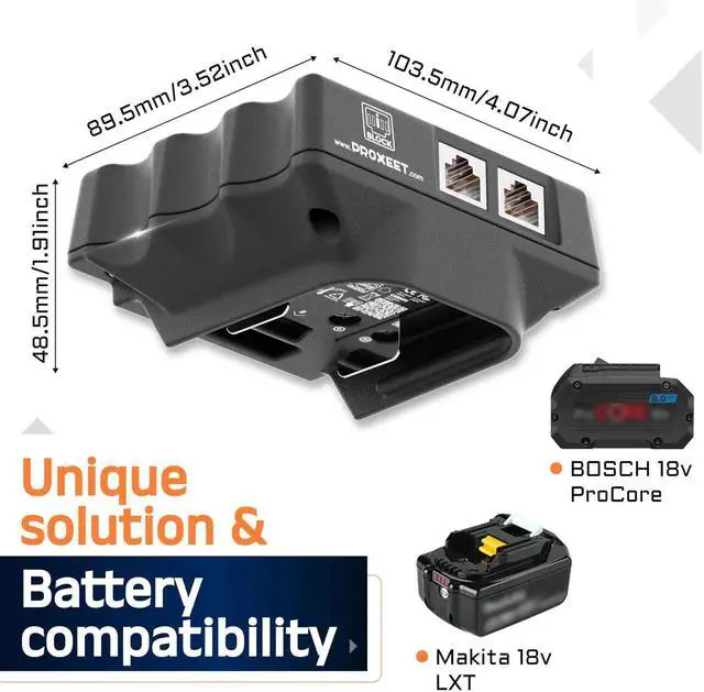 PortabilityCordless and powered by common 18-20 volts series. Compatible with Bosch and Makita cordless drill batteries. Also supports 14-20v DC up to 3.5A and works with BOSCH 18v ProCoreET-1 and Makita 18v LXT cordless drill batteries etc.
