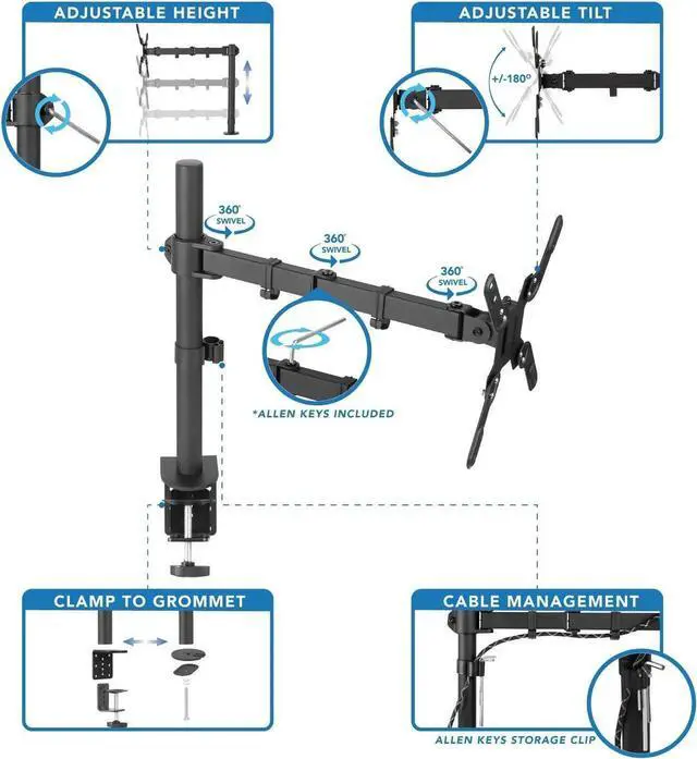 • FULL MOTION SINGLE MONITOR ARM - Adjustable arm swivels 360 degrees, 360 rotation between landscape and portrait. Tilts 15 degrees. The arm is height adjustable on the pole. Position of the monitor is easy to adjust.