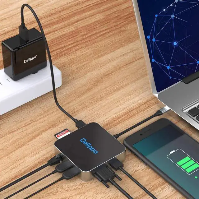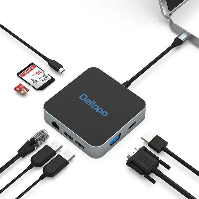 USB C Hub Docking Solution,Delippo 8 in 1 with Charger dongles Gigabit Ethernet Port, PD Type C Charging,4K HDMI,1080 VGA, SD TF Card Reader, 2 USB A Ports