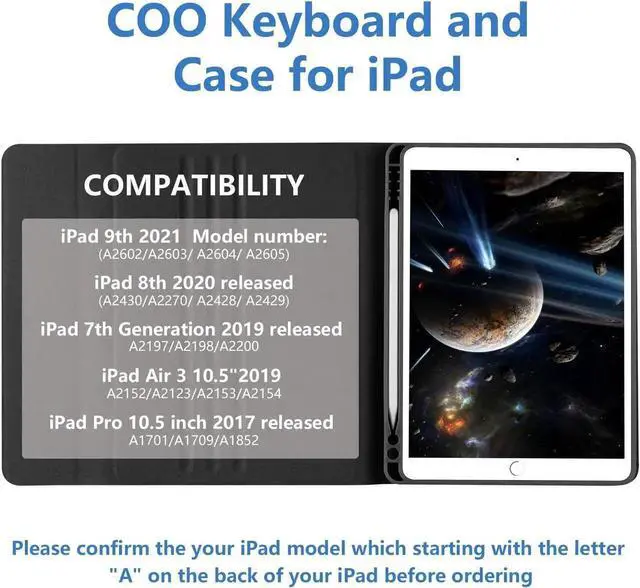 COO for iPad Keyboard Case Wide CompatibilityThis for iPad keyboard case is designed for iPad with 2021 9th Generation 10.2" 2021 (A2603/A2604/A2605), with iPad 2020 8th (A2270 & A2428 & A2429), with iPad 2019 7th (A2197-MW752LL/A & A2200-MW752LL/A & A2198-MW6C2B/A), with iPad 2019 Air 3 (A2152-MUUK2LL/Az & A2153-MV162LL/A & A2123-MV0E2B/A) and with iPad Pro 2017 10.5 (A1701-MQDW2LL/A & A1709-MQF02LL/A); Please be kindly check your iPad's back model before purchasing