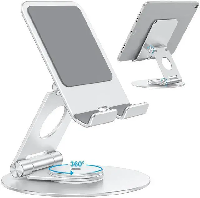 OMOTON Swivel Tablet Stand for iPad with 360 Rotating Base, Foldable Adjustable Holder for Drawing, Compatible with iPad Pro/Air/Mini and More, Silver
