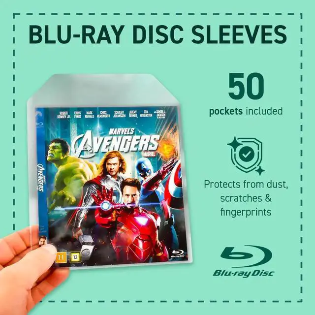 HOLDS BLU-RAY & COVER: Each sleeve holds both a Blu-Ray and its cover, with a capacity for 50 Blu-Rays. Perfectly sized for efficient storage and organization, they are ideal for collectors and enthusiasts seeking to maximize space.