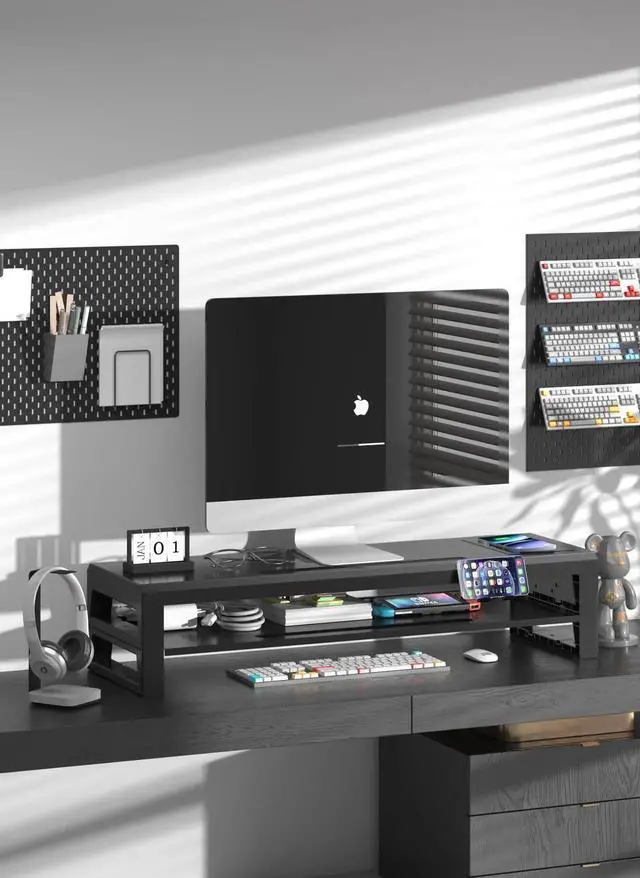 Upgrade your workspace with the GECKOSTROLL Dual-Layer Monitor Riser, a premium all-metal shelf system designed to enhance performance, comfort, and organization. Measuring 715mm in length and 220mm in width, this dual-tier riser provides spacious support for dual monitors, laptops, or desktop essentials. Built with a metal center shelf and sturdy ABS legs, it boasts an impressive 90kg load capacity. The integrated wireless charging pad and versatile USB hubfeaturing USB-A, USB-C for both charging and datamake it the ideal all-in-one desktop solution. Keep your phone visible and accessible with the included detachable stand, and enjoy a cleaner, more focused workspace.