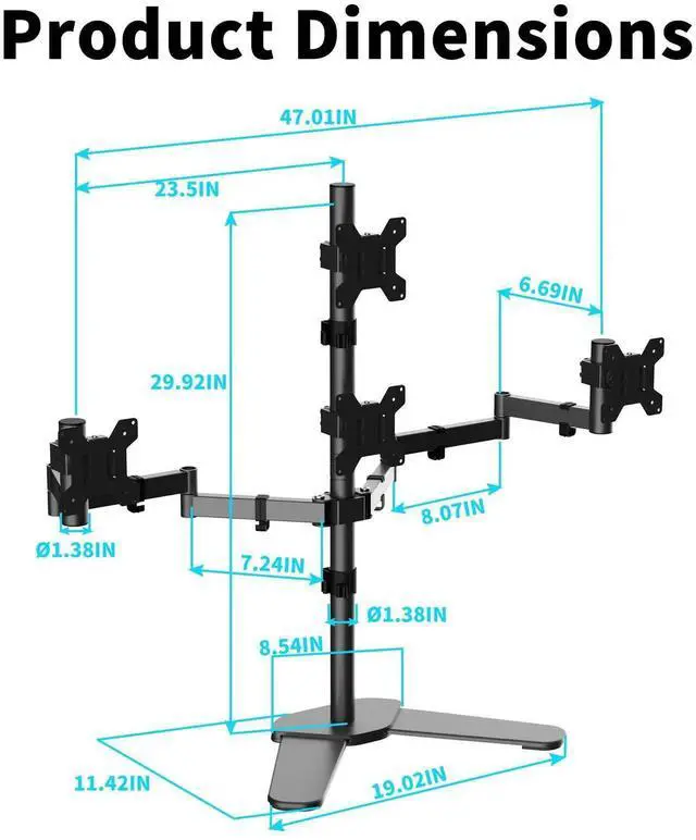 Pholiten Quad Monitor Freestanding Mount for 13-32 Inch Screens, Fully Adjustable 4 Monitor Stand with Base, Swivel, Tilt, Rotation, 75 * 75MM/100 * 100MM Vesa Stand, Max Load 22lbs