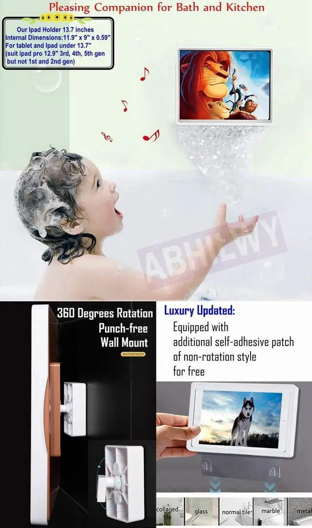 ABHILWY Shower Tablet Holder Waterproof Compatible with Ipad, Wall Mounted Bathroom Tablet Case Rotation, Adhesive Touchable Cradle with Glass Mirror Anti-Fog Screen for Kitchen 12.9 inches Luxury