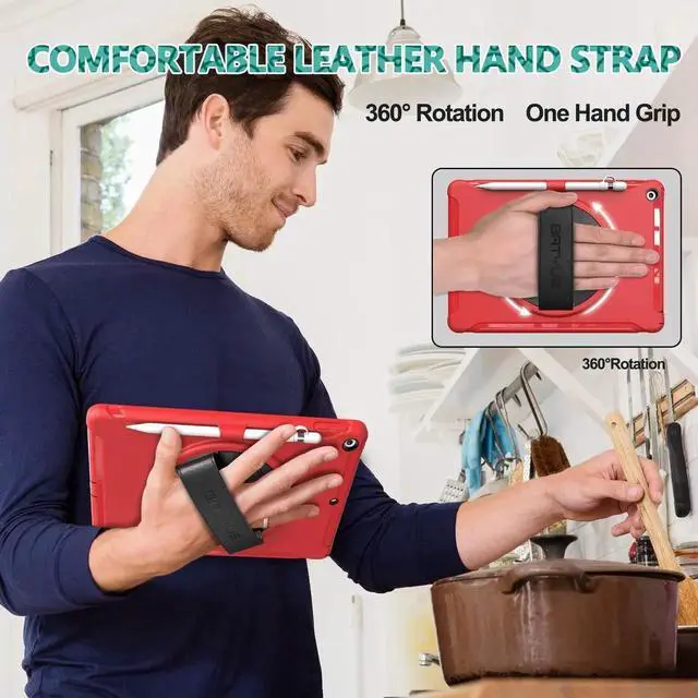 BATYUE Case for iPad 9th/ 8th/ 7th Generation (iPad 10.2 inch Case 2021/2020/2019) with Screen Protector, Rotating Stand, Hand Strap, Pencil Holder (Red)