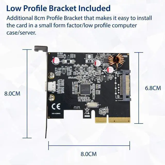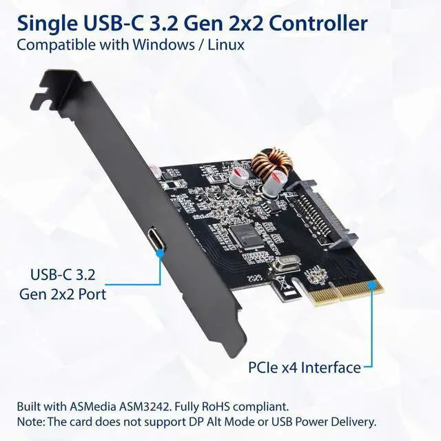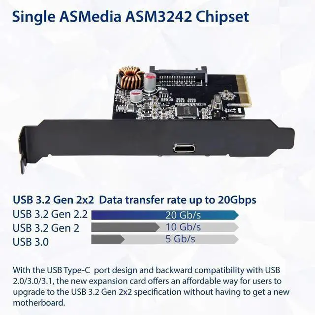 The new expansion card adds full support for the new specification on motherboards with a PCIe x4 slot. With the USB Type-C port design and backward compatibility with USB 2.0 / 3.0 / 3.1, the new expansion card offers an affordable way for users to upgrade to the USB 3.2 Gen 2x2 specification without having to get a new motherboard.