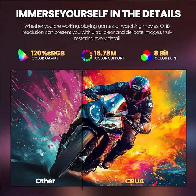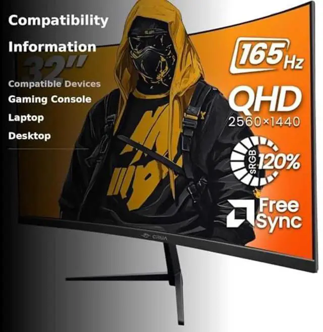 CRUA 32" Curved Gaming Monitor, 2K QHD 2560x1440P, 144Hz/165Hz Computer Monitors, 120% sRGB, FreeSync, Low Blue Light, 1800R VA Screen, HDMI 1.4 /DP 1.2, Wall Mountable - Black