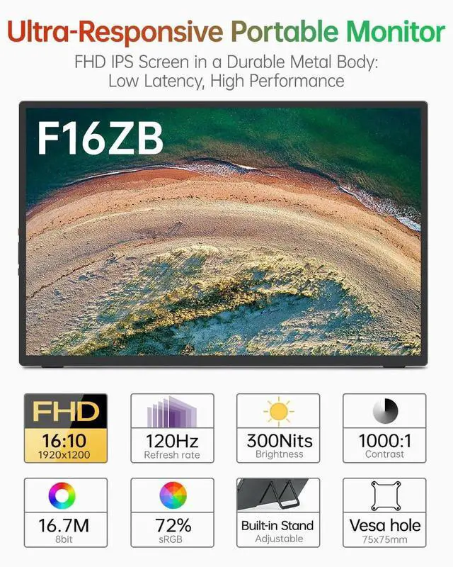 Intehill 16" 120Hz Portable Gaming Monitor, Anti-Glare Portable Monitor with Full-covered Tempered Glass, USB-C HDMI External Display w/Speakers & Stand, Travel Monitor Second Screen for Laptop, F16ZB