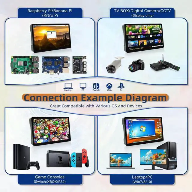 Wide compatibility: This 7inch raspberry pi display is perfectly suited for all versions of Raspberry Pi including Raspberry Pi 5/4/3/2/3B+/BB.Other devices like Octo Pi, Banana Pi,Retro Pi, laptop, PC,etc.The por