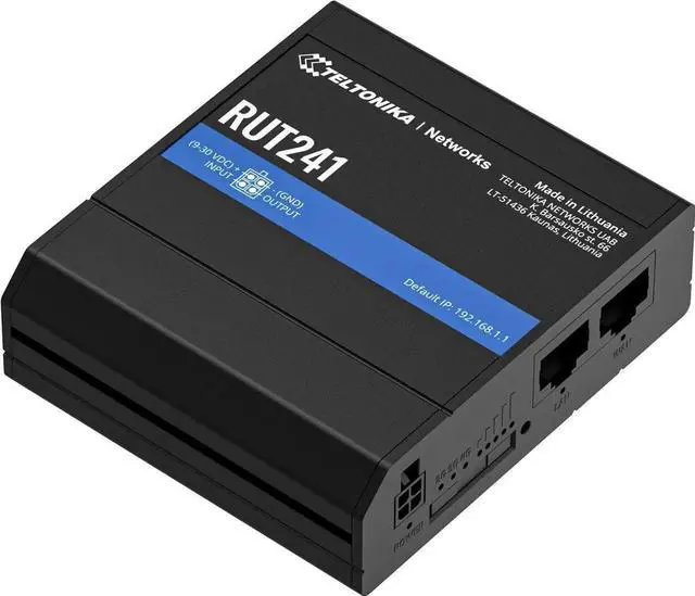 Teltonika RUT241098000 Model RUT241 Industrial Cellular Router; 4G and 3G Connectivity; For use in North America; Compatible with Verizon, AT&T, and T-Mobile; WAN Failover with Auto Switching