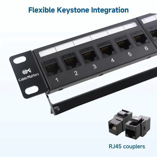 Flexible Keystone Integration: This patch panel's standard keystone sockets allow for easy customization with various keystone jacks, accommodating diverse network needs by enabling the replacement of the default RJ45 couplers.