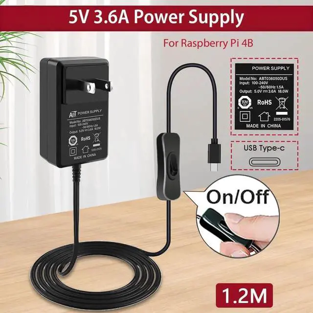 18W Type C Power Supply --- 5V 3.6A Type C Power Supply will make work more stable. Input: 100-240V AC~50/60Hz; Output: 5V 3.6A; Extended Cord: 120cm