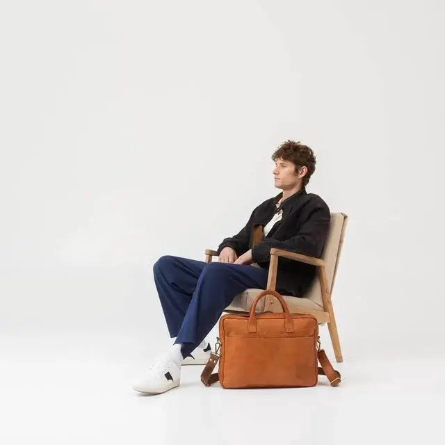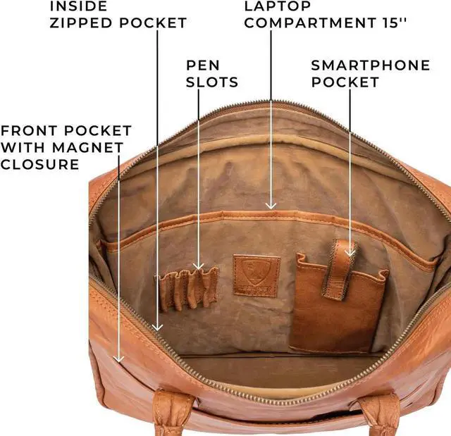 DESIGNED IN BERLIN, GERMANY. The Madrid leather laptop bag is thoughtfully designed in Europe and crafted from high-quality, durable materials for long-lasting use. This cotton-lined satchel features a spacious main compartment, a 15 laptop compartment, a phone pocket, pen holders, and zippered pocket. Durable metal hardware and YKK zippers ensure long-lasting use.