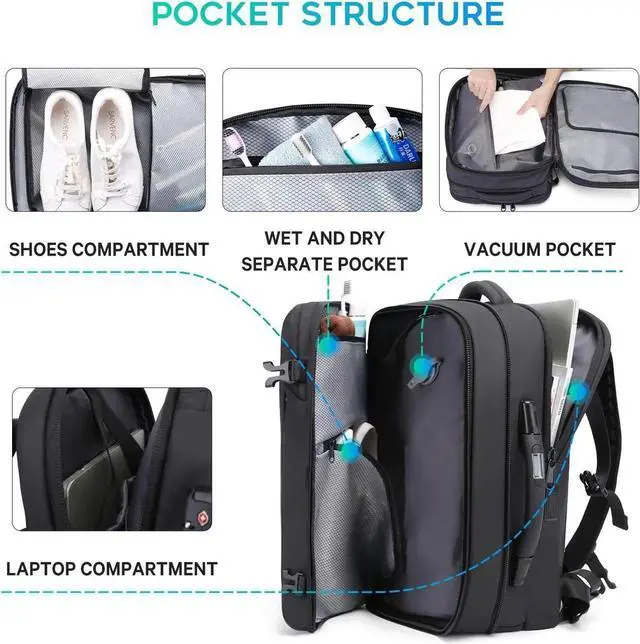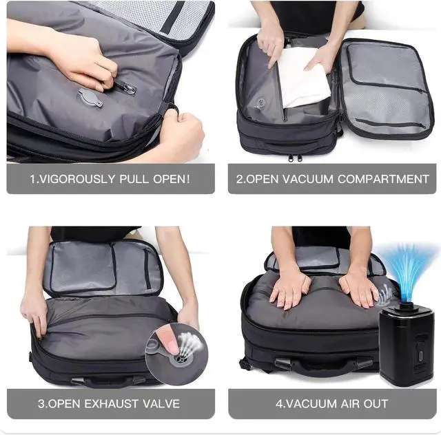Vacuum CompressionBange travel backpack is designed with vacuum compression that compresses clothing and other packable items, optimizing space so you can carry more. The main zipper is designed to be tight, will need some strength to pullbut the zipper made in durable BBS zipperdon't worryit cannot be broken