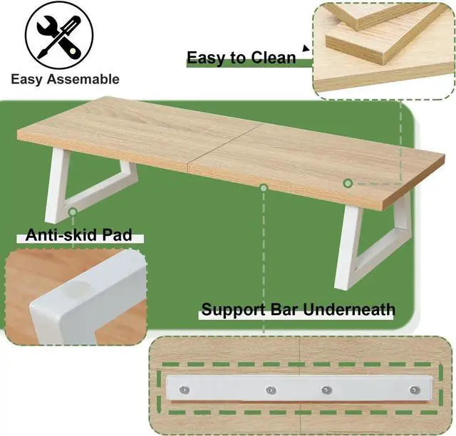 Spacious Wood SurfaceThe wood top surface area is large and wide enough to hold your monitor/ laptop & docking station, it is smooth, comfortable, and trendy.