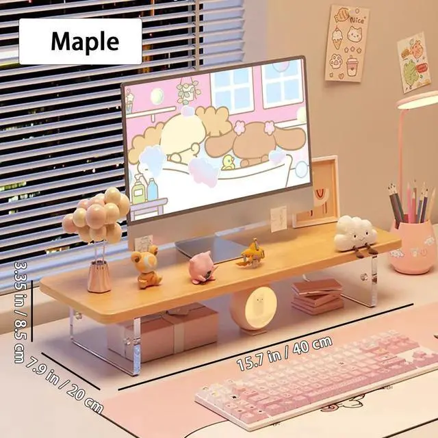 The solid wood desktop is smooth, stylish, and comfortable, offering a great workspace. The transparent acrylic base creates a unique floating effect, adding a touch of modern design. Assembly is simple with pre-drilled holes and all necessary tools and parts included. This stand can be used for various purposes, such as a monitor stand, printer stand, TV riser, laptop holder, or even as a makeup organizermaking it an ideal space-saving solution for any desk.
