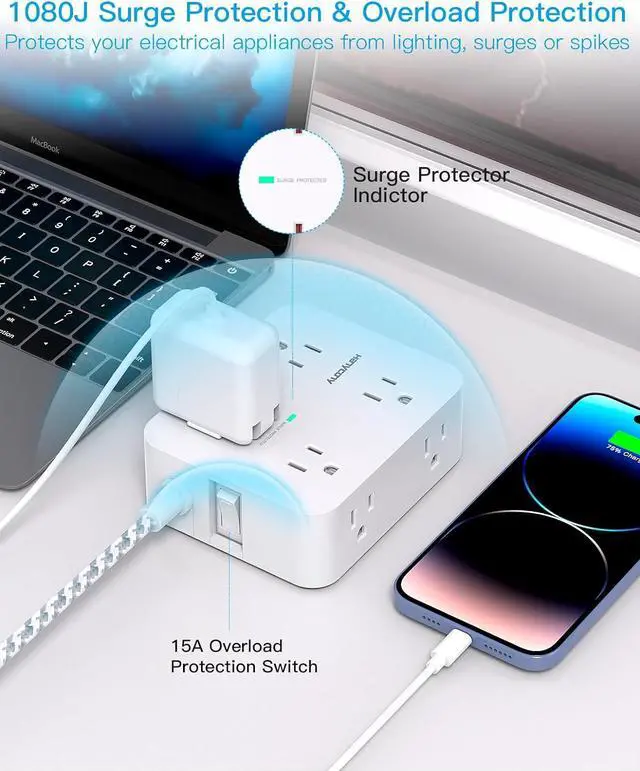 Overload Surge Protection- The surge protector power strip with overload protection protects your electrical appliances from lighting, surges or spikes. The minimum energy-absorbing capacity of 1080 Joules. Lighted on/off switch with integrated circuit breaker for overload protection of all outlets. (The " Surge Protected indicator light on to show your devices are protected)