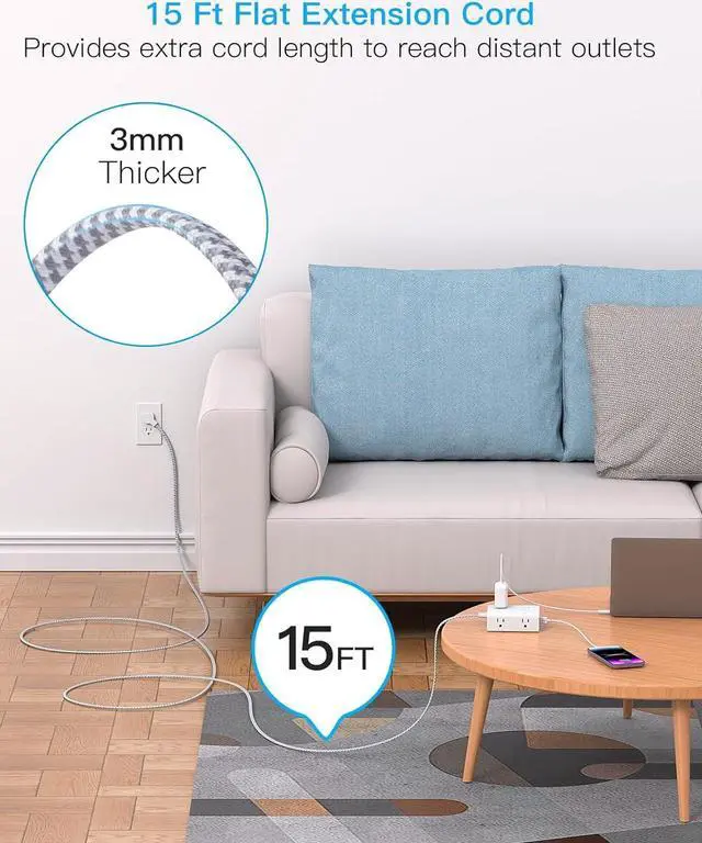 15 Ft Flat Extension Cord & Ultra Thin Flat Plug Power Strip The 15 Ft flat plug extension cord with multiple outlets, long enough to reach wall outlet sSockets, suitable for the home, office, and college dorm room essentials. With only 0.35 inch flat wall plug, this 15 ft power strip surge protector can infinitely close to the wall, hide in the back of furniture, bed or refrigerator, maximum save you space. The 45° right angle low profile flat plug design keeps anther outlet free.