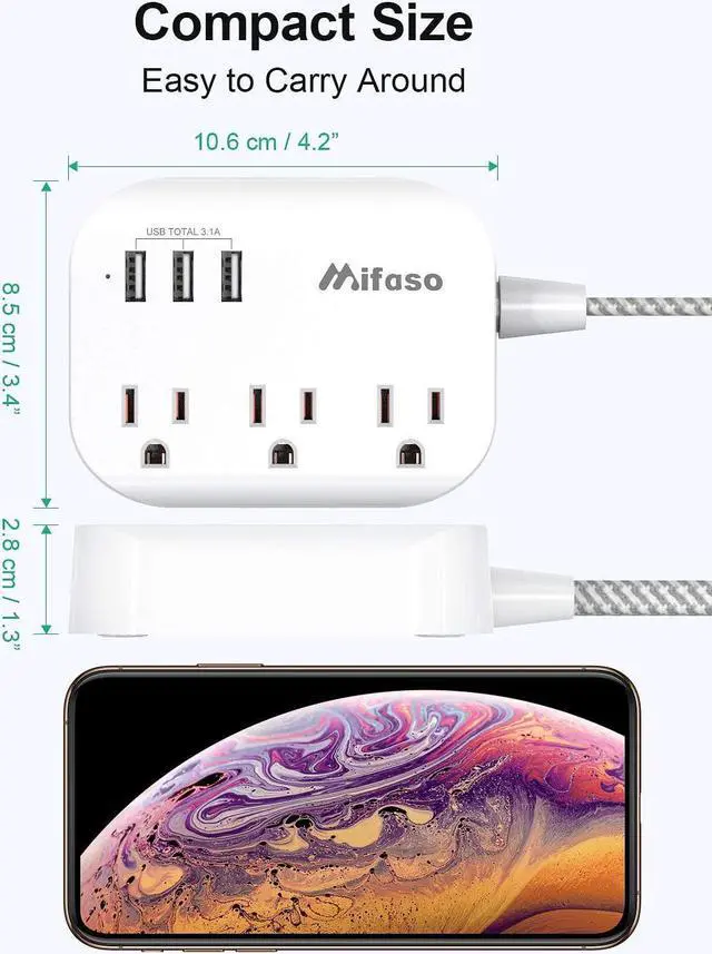 13A 5 FEET UL APPROVED EXTENSION CORD- Mifaso 3 usb power strip provide a rated power of 1625W (125V~ 13A) and a wide range of power distribution 100~240V, 3 USB charger and 16AWG 5 feet heavy duty extension cord can meet most applications. The braided power cord is not easy to deform, durable and more safety than other power cord.