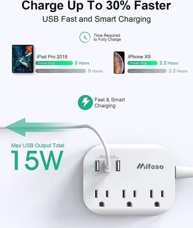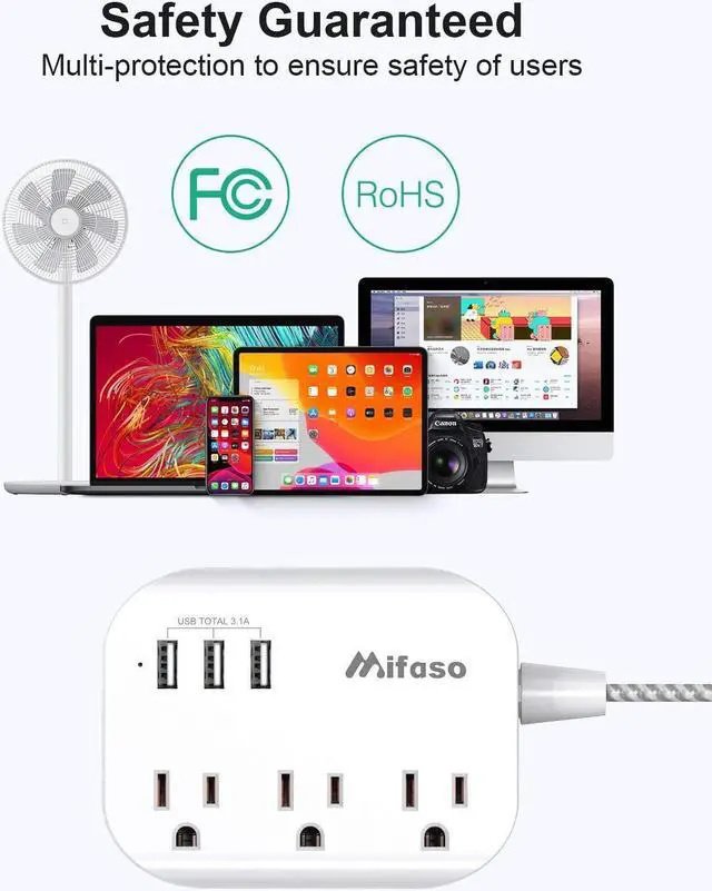 DESKTOP USB CHARGING STATION - Mifaso desktop Outlet extender design with anti-skid Pad, make it more stable on the any table. Built-in high-quality components, enhanced circuitry and fireproof housing, over-current/over-charge / short-circuit/over-heated keep you and your devices safe with multiple protections. As an extension cord with 3 usb ports, 5V/ 2.4A max charging current in one socket at a time would charging most of your usb devices.