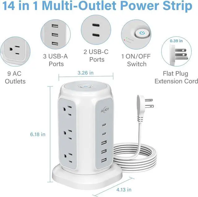 14-in-1 Power Strip Tower: Features 9 AC outlets and 5 USB ports, allowing you to connect up to 14 devices; The 1.3 -inch spacing between outlets accommodates large plugs without blocking, maximizing the use of every outlet