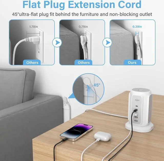 Flat Plug Extension Cord: With 0.39 -inch flat plug design and 6.5 feet thin extension cord fit in tight spaces, making it easy to hide behind furniture; The 45° right angled plug prevents blocking the second outlet; This thoughtful design maximizes outlet space, making it easier to use all the available ports, whether you' re charging electronics, powering lamps, or connecting office equipment