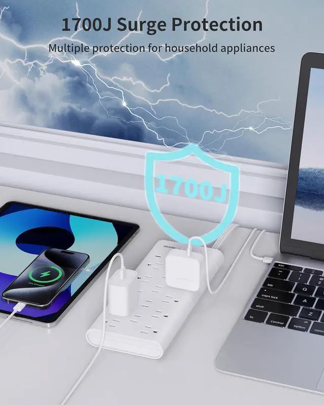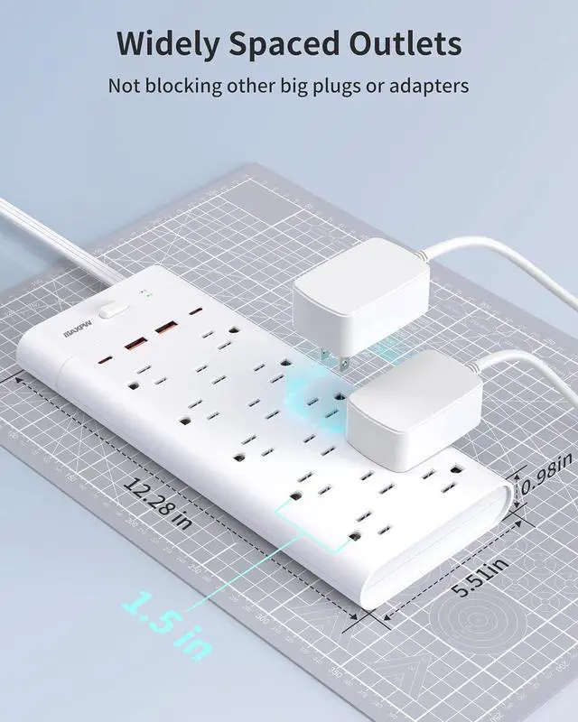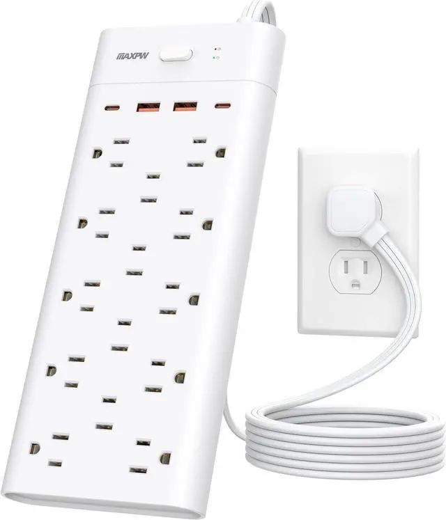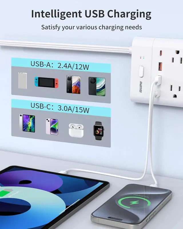 Smart USB Charging-Say goodbye to bulky USB chargers. This power strip with USB ports has built-in smart USB port technology. There are 2 USB-A (Max 12W/ 2.4A ) and 2 USB-C (Max15W/3A) ports. Each port provides optimized charging for smartphones, game consoles and more.