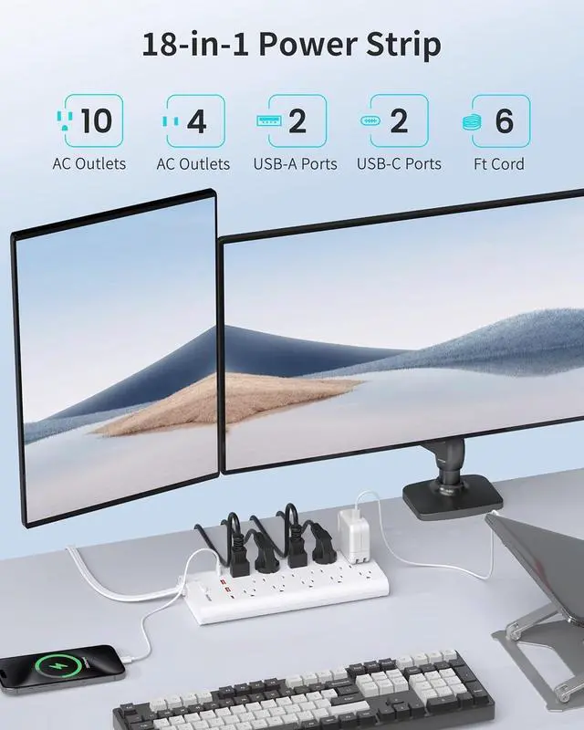 18-in-1 Multi Plug Outlet-Easily power up to 18 devices simultaneously. This 6 ft power outlet features 14 AC plugs (1875W/125V/15A), 2 USB-A and 2 USB-C ports (total output 17W/ 3.4A ). Provides everything needed to power multiple appliances and mobile devices at the same time.