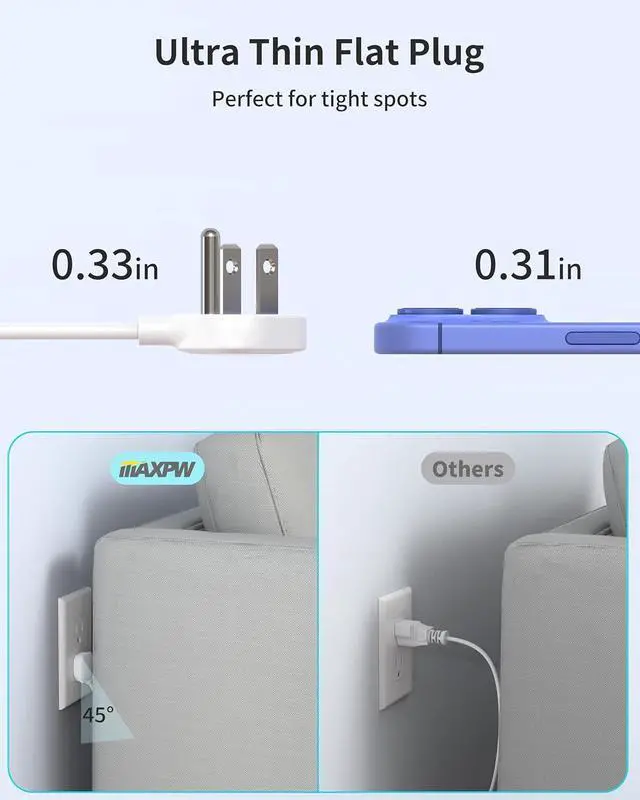 Large Pitch Outlet Design-Outlet extensions spaced 1.5 inches apart. Widely compatible with tablets, cell phones, watches, headphones, in-ear headphones and other devices.