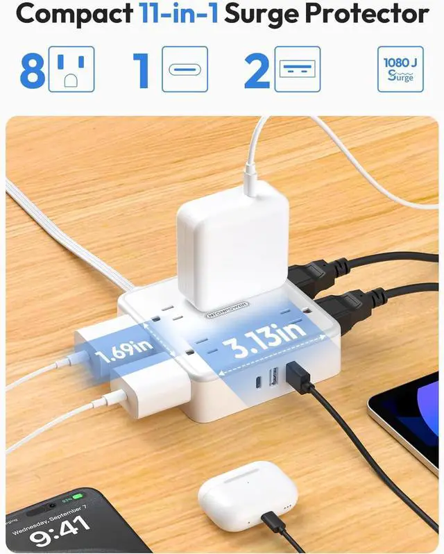 Compact Power Block with 11 Plugs: Unlike the power strips of days gone by, this compact surge protector comes in a 4.2 " x 4.2 " compact size with 8 AC plugs and 3 USB ports for extreme space-saving on your desk. The block cube design takes up less desk or tabletop space, allowing it neatly and conveniently to lay on a desk or wall mounted.