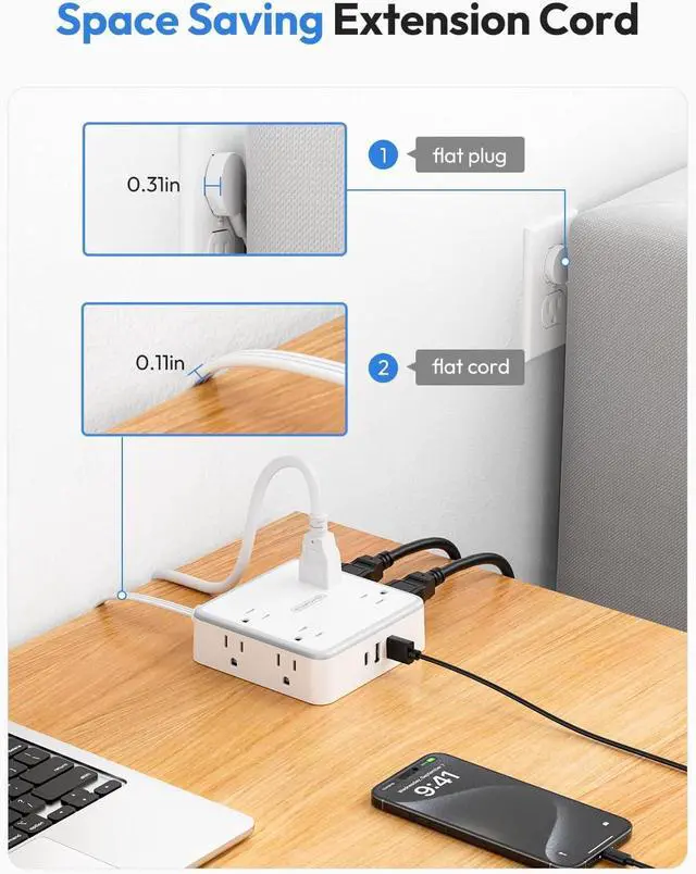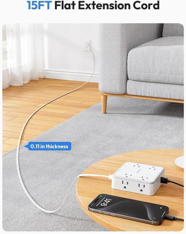 Flat Extension Cord: With a 15 ft cord, this surge protector is long enough to reach most areas. The 0.11 in flat extension cord is half thinner than the ordinary round cord, which discreetly fits through doorways or under carpet and the 0.31 -inch plug can be hidden behind furniture to save space.