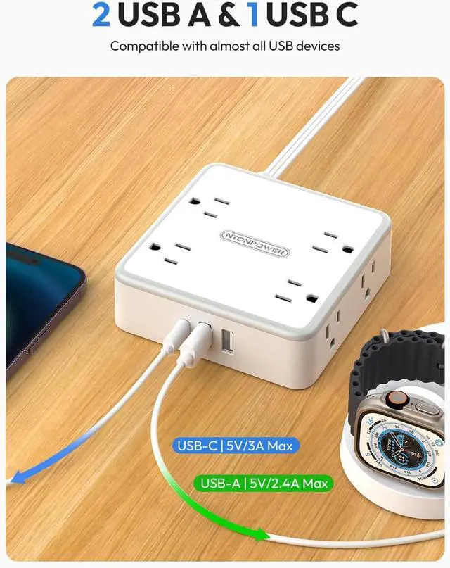 Wide-Space AC Outlets: The 3.13 in & 1.69 in wide spaces make it easier to plug in any big charger, bulky adapters, or transformer plugs, without sacrificing any of the outlets. The outlets are available on 3 sides, which also creates a lot of extra capacity so that you can enjoy all 8 AC outlets in use and share.