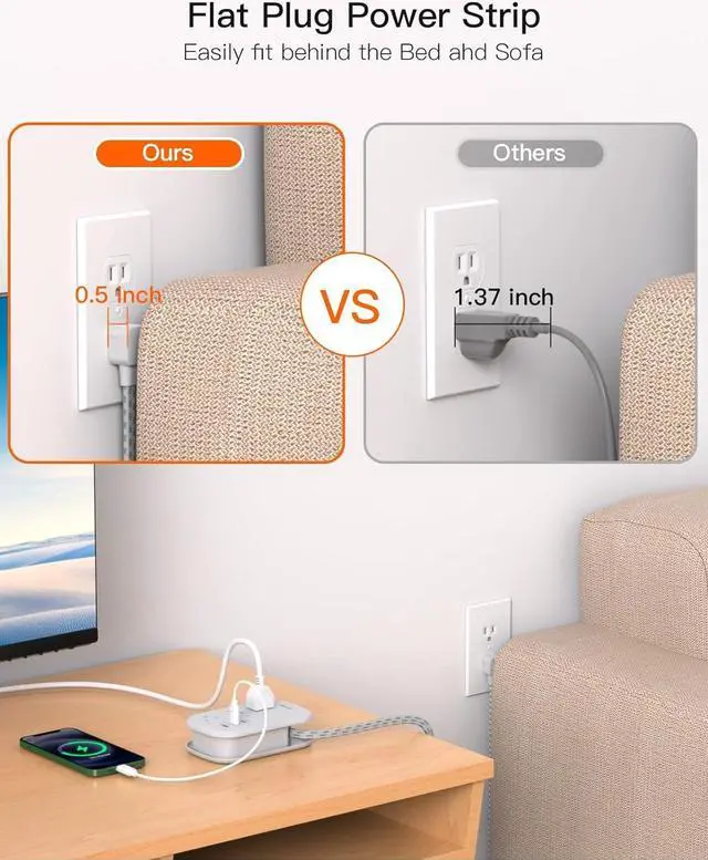 Space Saving Flat PlugWith only 0.5 -inch ultra slim design, flat wall plug is much thinner than traditional plugs, which can close to the wall easily, and hide in the back of furniture, bed, or refrigerator, no waste for outlet and space.