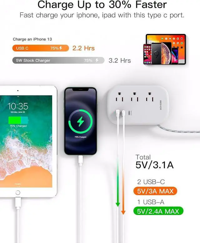 6 IN 1 Power Strip with USB-CGrey flat extension cord with 3 AC outlets and 3 USB ports can power up 6 devices simultaneously (the actual current is decided by the demand for the devices). Compatible with your cellphone, laptop, tablet, earphone, or cameras without a variety of converters, keeps your desktop organized, a must-have accessory for a colleague' s dorm room, home, office, bedroom, kitchen, etc.