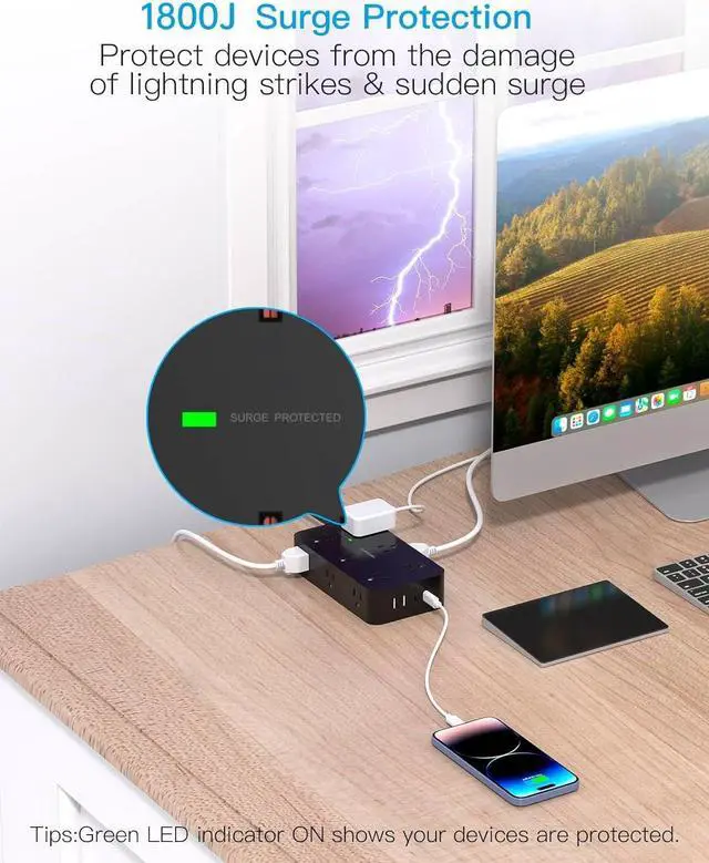Power Strips with Surge Protection - The power strip surge protector built-in 1800 joules surge protection for your phone, computer and other applianced from spikes and fluctuations. The on/off switch with integrated circuit breaker for overload protection of all outlets. It will automatically cut power to protect connected devices when voltage surge is overwhelming. (The surge protected indicator light on to show your devices are protected. )