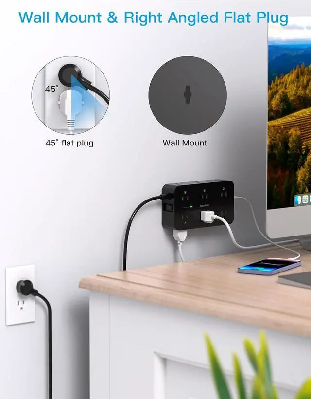 Extension Cord with Multiple Outlets - This 6 feet black extension cord with 12 AC outlets and 4 usb ports (2 USB C) power everything on your desk. With built in Smart IC technologythe 4 usb port can auto detect and deliver appropriate current to your devices. There are 2 keyholes on back allows you can mount this extension cord onto the wall or furniture easily. The 45° angled flat plug fits perfectly in narrow spaces like behind a bookshelf, nightstand and does not cover the bottom receptacle of a duplex outlet
