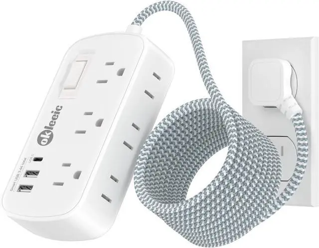 15FT Long Extension Cord & 45° Right Angle Flat Plug 15 ft flat power cord allows it to reach anywhere in the room without tangling and being more flexible. Braided extension cord is not easy to deform, durable and safer than other powerstrip. The slim 0.6 inch plug and 45° right Angle design allow this flat plug power outlet to be easily installed in narrow gaps behind furniture without obstructing the use of other power strips.