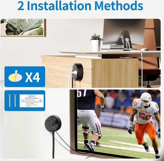 2 Ways to Install & Cruise Ship Approved The extension cord with USB ports provides 2 installation methods. The 2 screws and one mounting template can help you quickly install the extension cord on the wall. If it is not convenient to use screws, 4 adhesive sticker pads can also help you fix the power strip on the wall. Our extension cord with USB ports is also cruise ship approved and it can help you extend your charging outlets when you are traveling on the royal cruise ship.